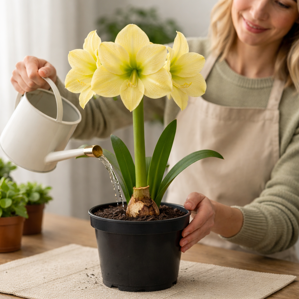 Амариліс «Люсія» ідеально підходить для вирощування в квартирі. Йому не потрібні теплиці, лампи чи складні умови — достатньо світлого місця та помірного поливу. Рослина добре переносить звичайний домашній мікроклімат і радує стабільним, рясним цвітінням.