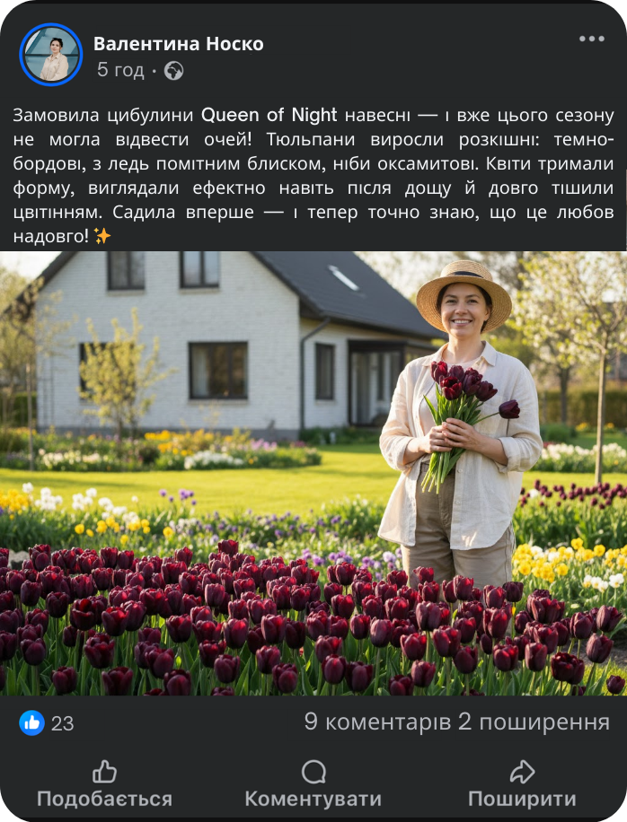 Весняна посадка дозволяє контролювати умови росту з перших днів: достатньо сонця, пухкий ґрунт і помірний полив — і рослини активно розвиваються. Тюльпани Queen of Night формують елегантні темні бутони з глибоким, насиченим відтінком, які виглядають особливо ефектно на тлі свіжої весняної зелені.
