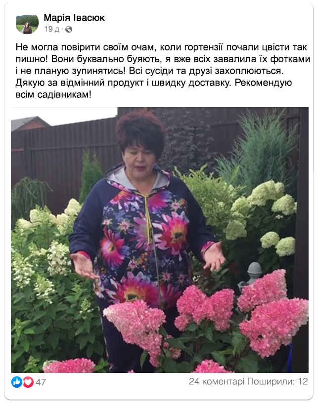 8.2. Живі рослини/саджанці (товари, що швидко псуються) — поверненню не підлягають, окрім випадків: пошкодження при транспортуванні, пересортиця або істотна невідповідність опису. Про такі випадки потрібно повідомити протягом 24 годин з моменту отримання, надіславши фото/відео-підтвердження.