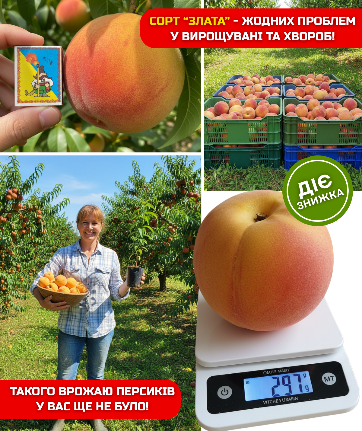 Плоди «Злати» вражають своїми розмірами – в середньому до 300 г, а окремі екземпляри навіть більше. Це соковиті, медово-солодкі персики, які стануть окрасою будь-якого столу та викличуть захват у гостей.